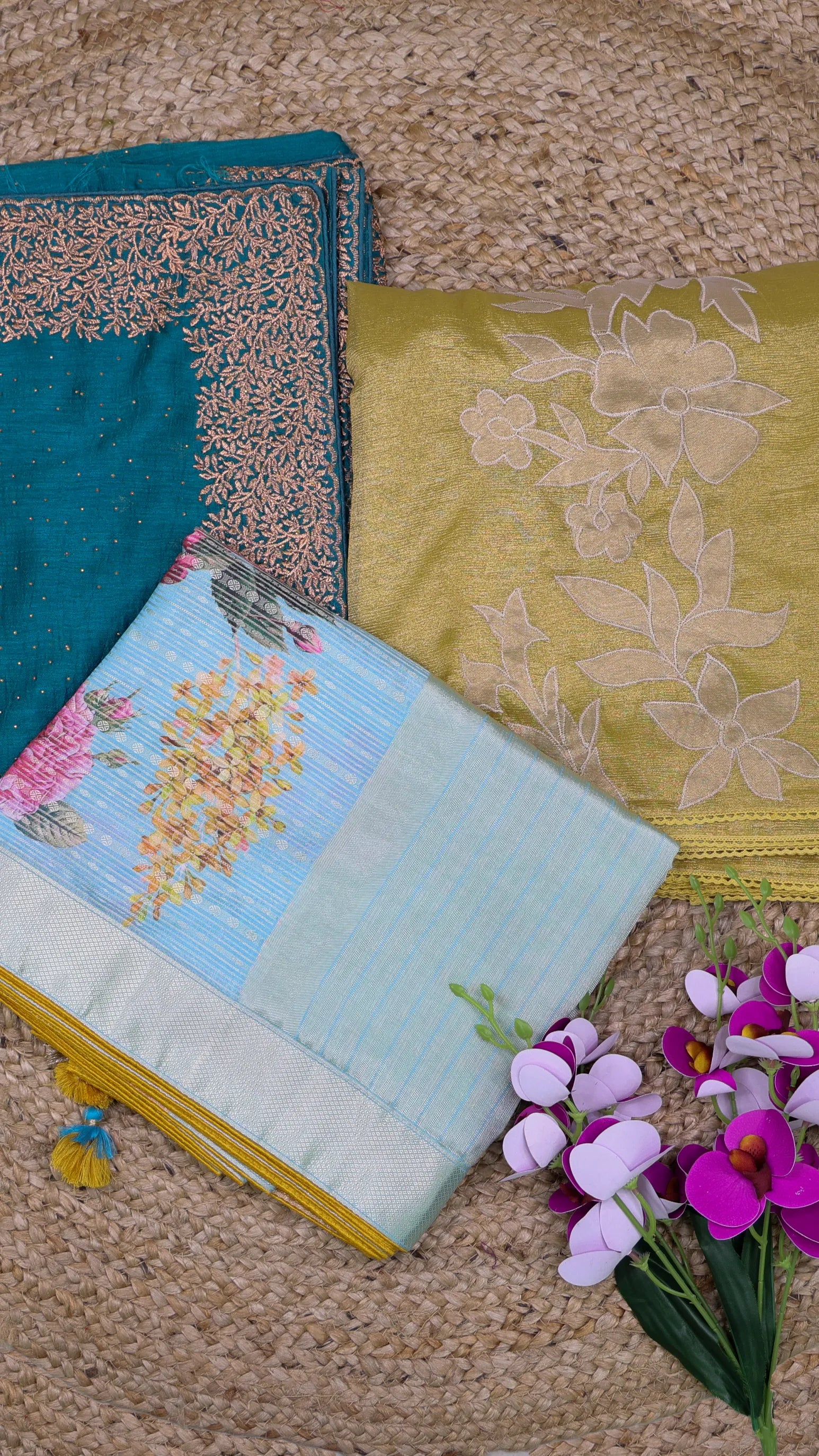 Curated trio of embroidered silk sarees, each piece showcasing intricate threadwork that elevates traditional draping. This collection pairs versatility with craftsmanship—ideal for building a refined wardrobe with complementary designs and color palettes. Perfect for those seeking investment pieces that transcend seasonal trends.