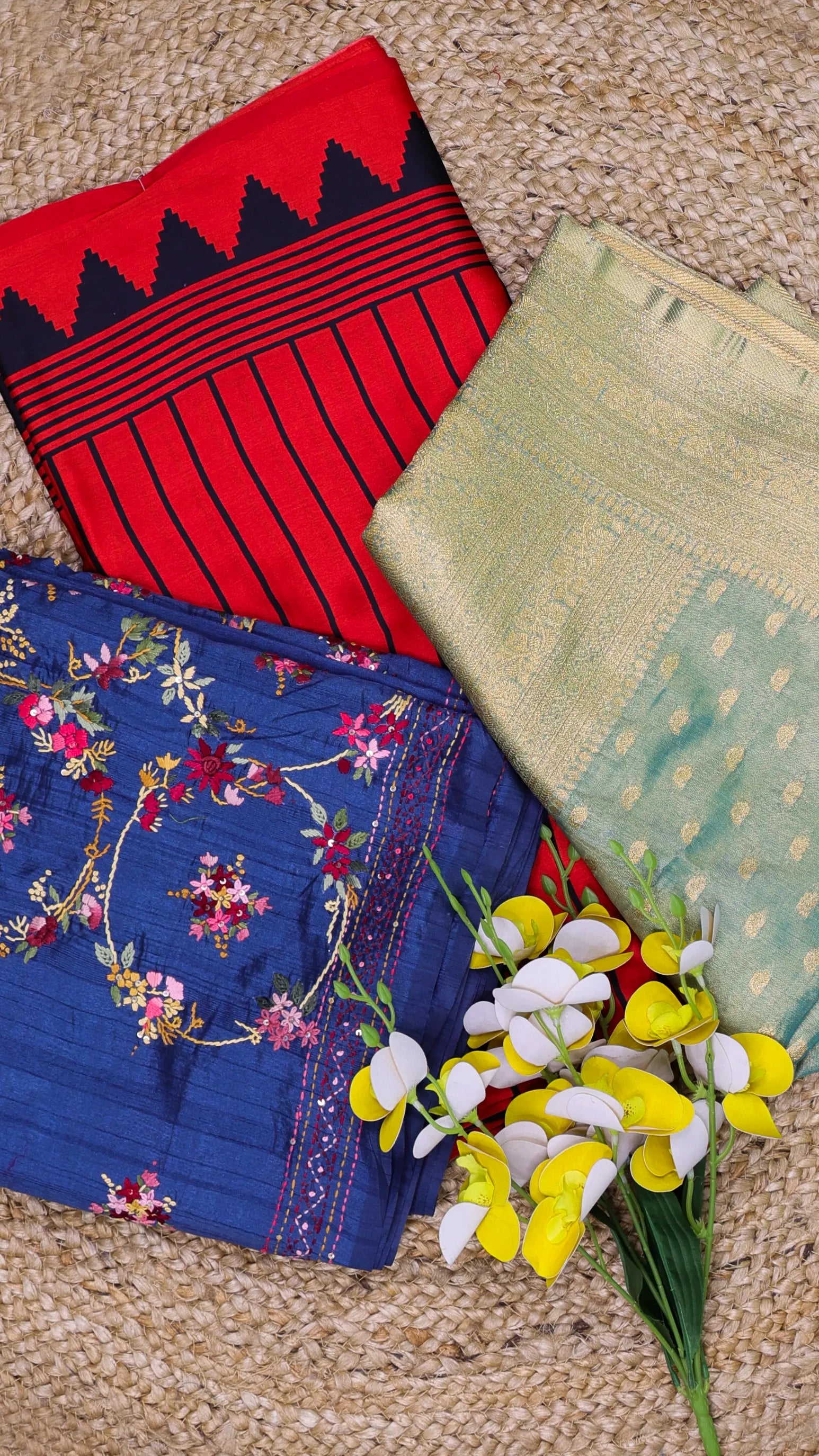 Curated trio of versatile sarees spanning three distinct weaves. The Kantha offers hand-embroidered heritage charm with textured appeal, while the Modal delivers fluid drape and everyday comfort. The Tissue Silk brings lightweight elegance with a subtle sheen—ideal for layering or formal occasions. Perfect introduction to premium saree variety or thoughtful gift for the discerning collector.