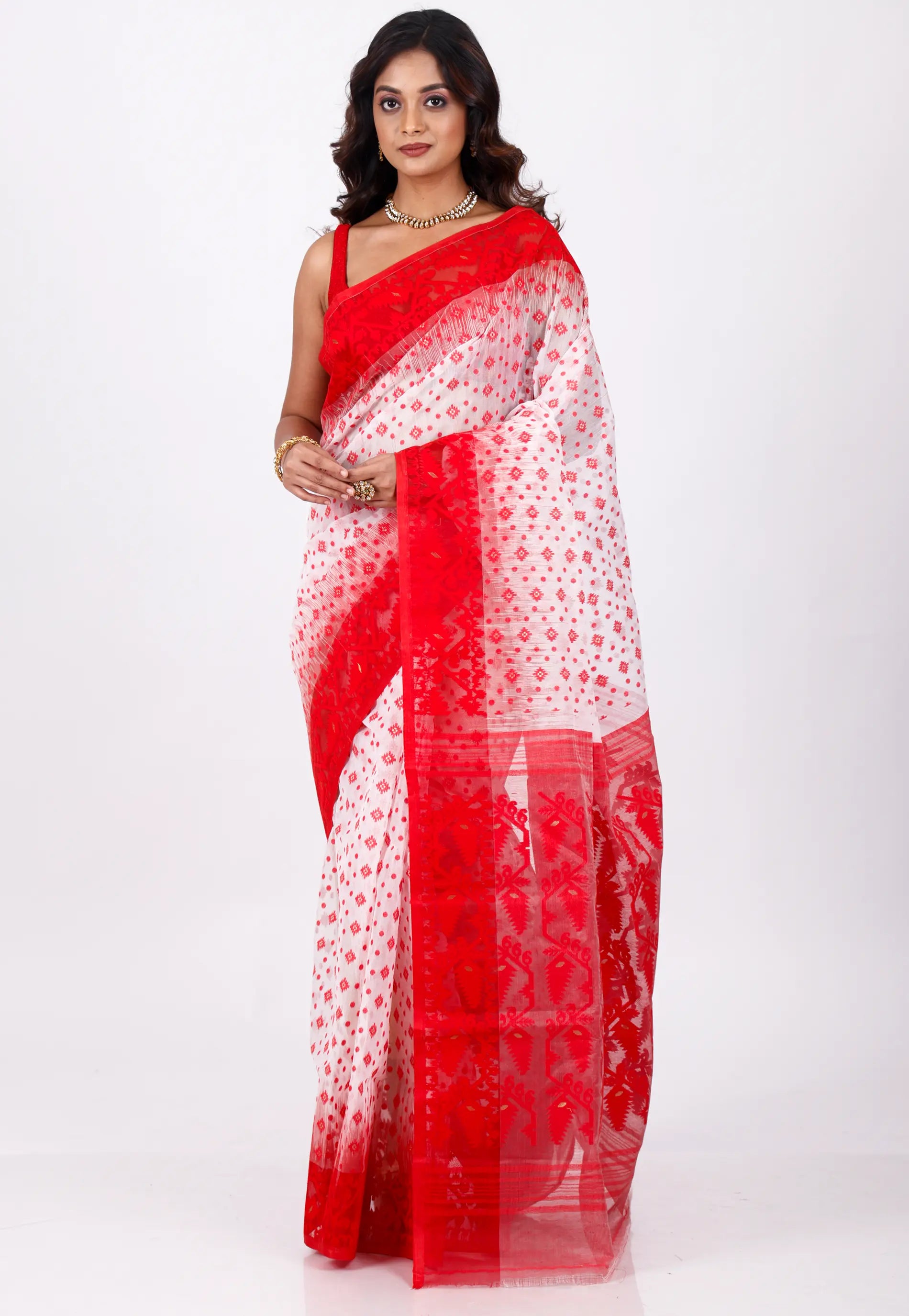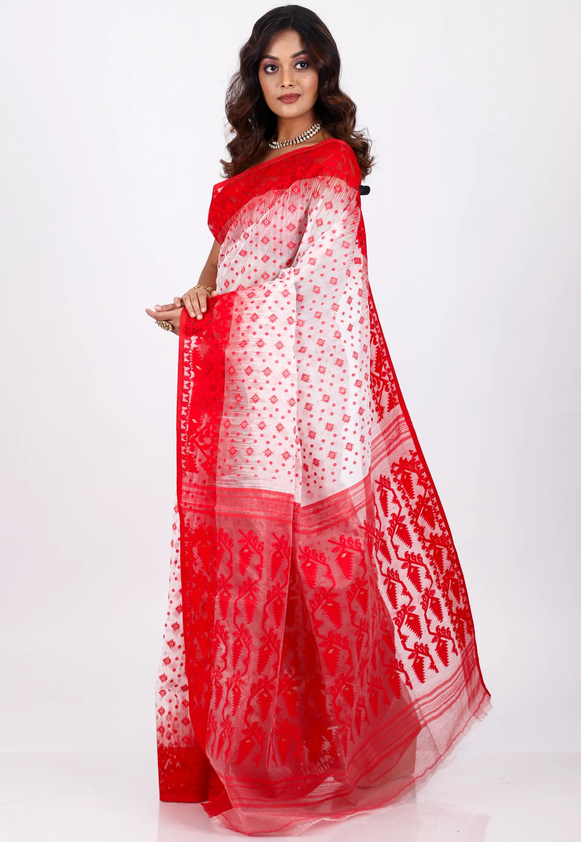 White with Red Border Dhakai Jamdani Cotton Saree without Blouse Piece